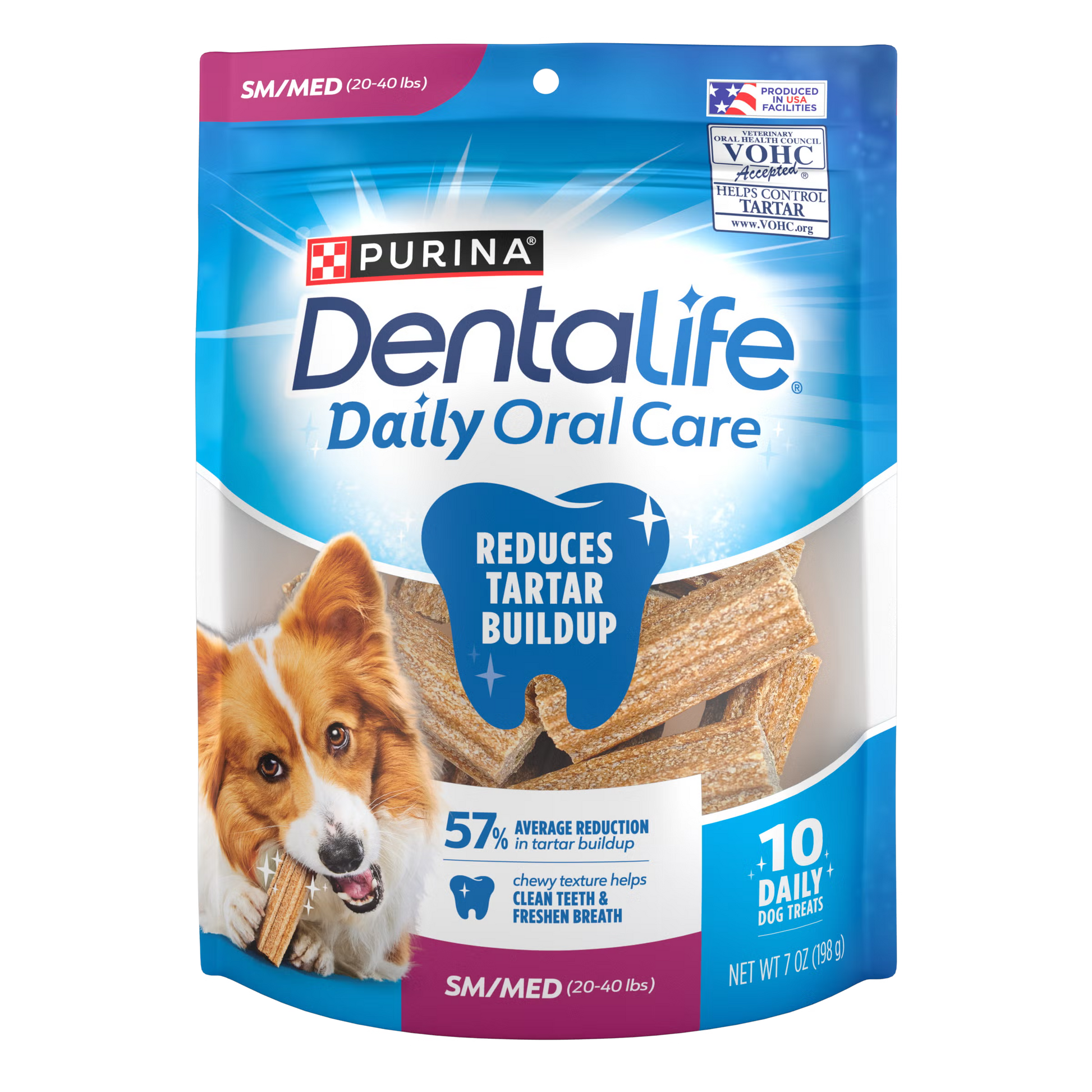 Purina® DentaLife® Daily Oral Care son premios dentales para perros diseñados para apoyar la higiene oral diaria de forma práctica y efectiva. Su textura masticable y porosa está formulada para ayudar a limpiar los dientes, incluso en las zonas de difícil acceso, contribuyendo a reducir la acumulación de sarro.